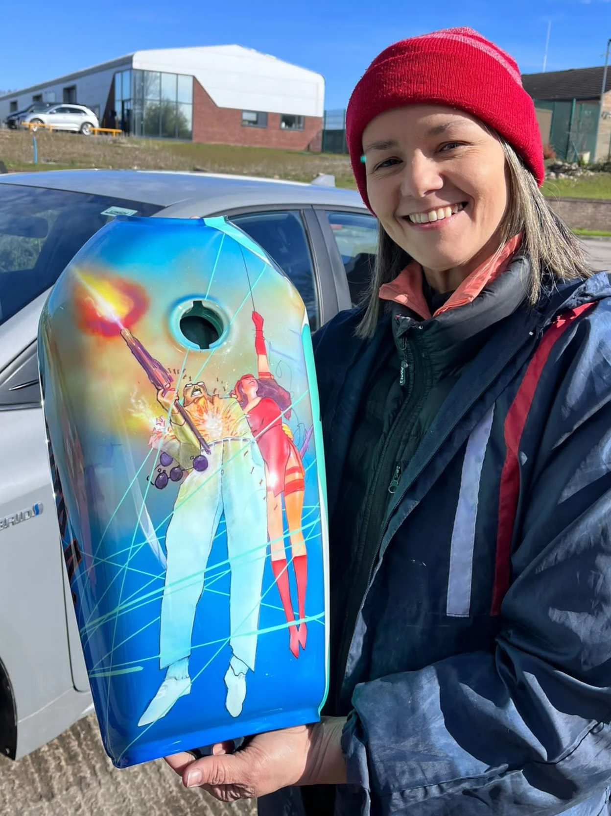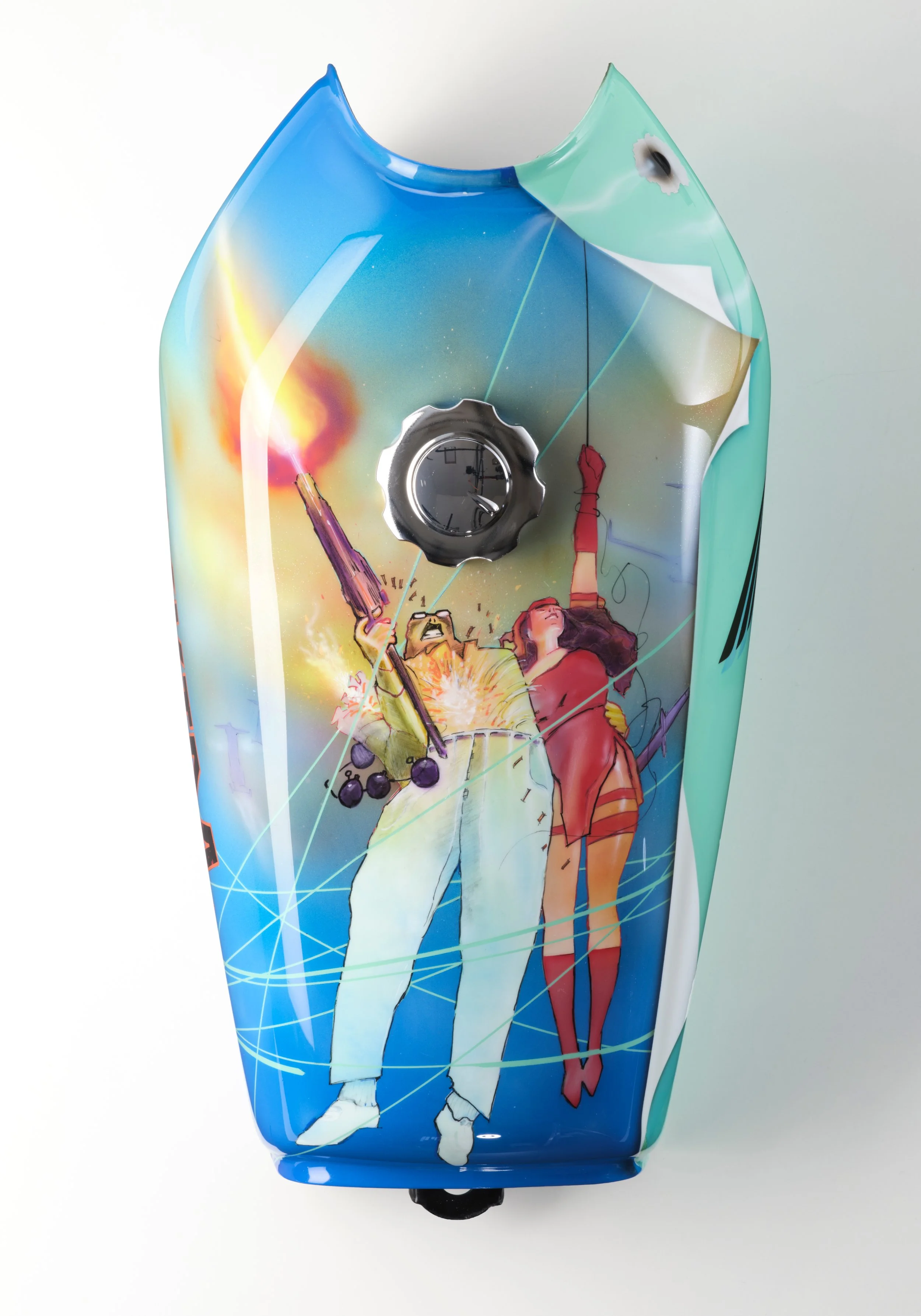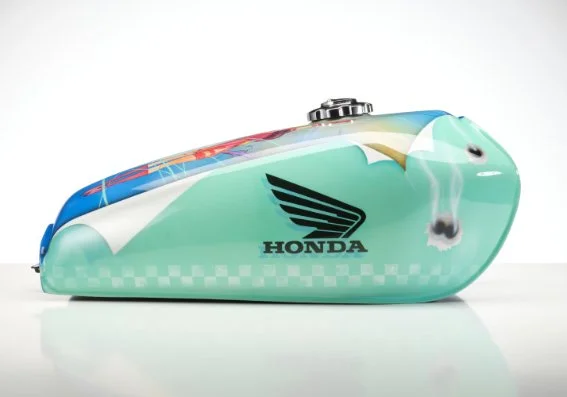 Custom-painted tanks, panels and vehicle parts, combining illustration with automotive paint processes